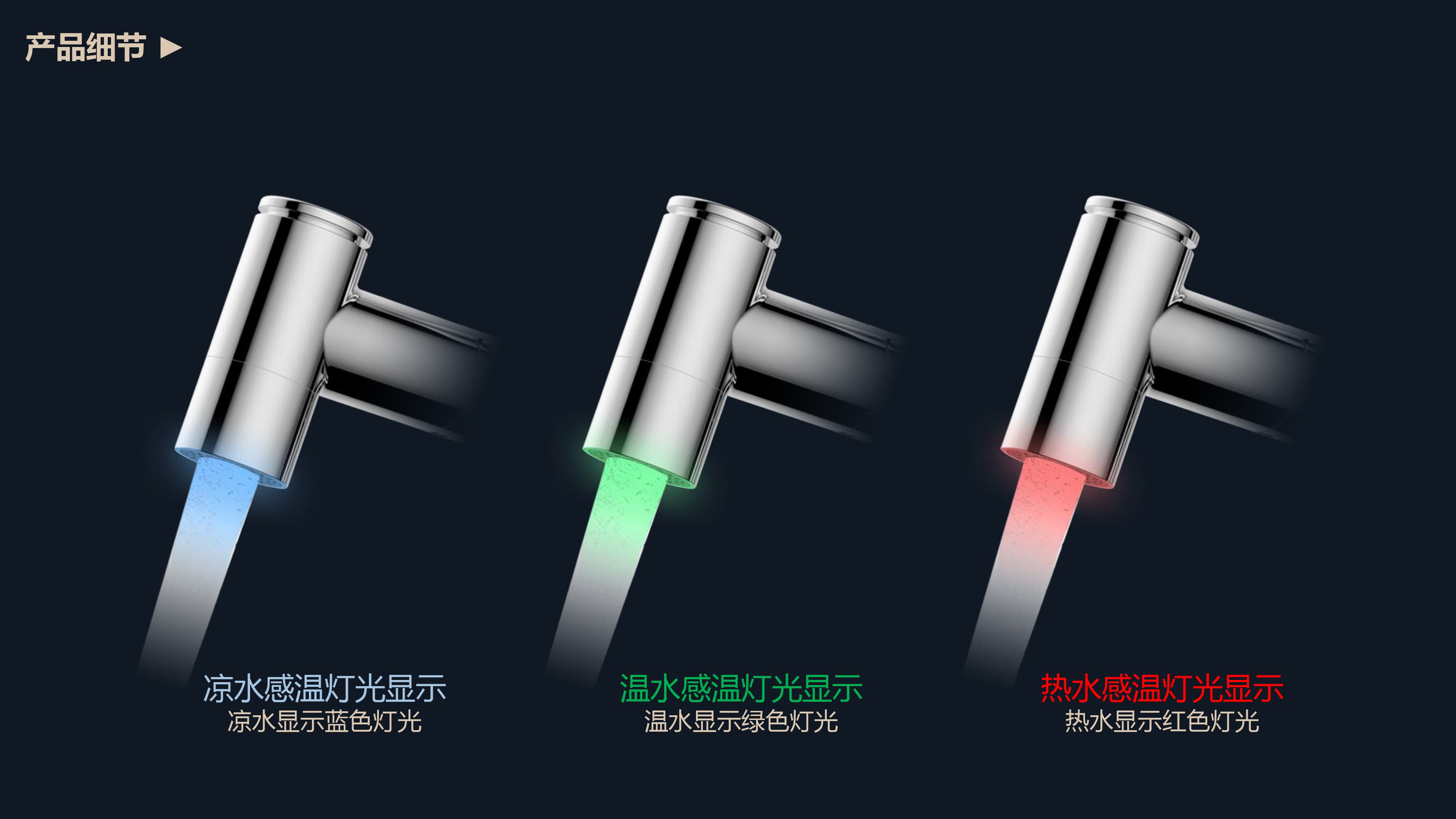 溫感三色LED燈光出水;日常洗頭利器,抽拉出水輕松洗;按壓切換兩功能水花;適合4寸3孔安裝臺面