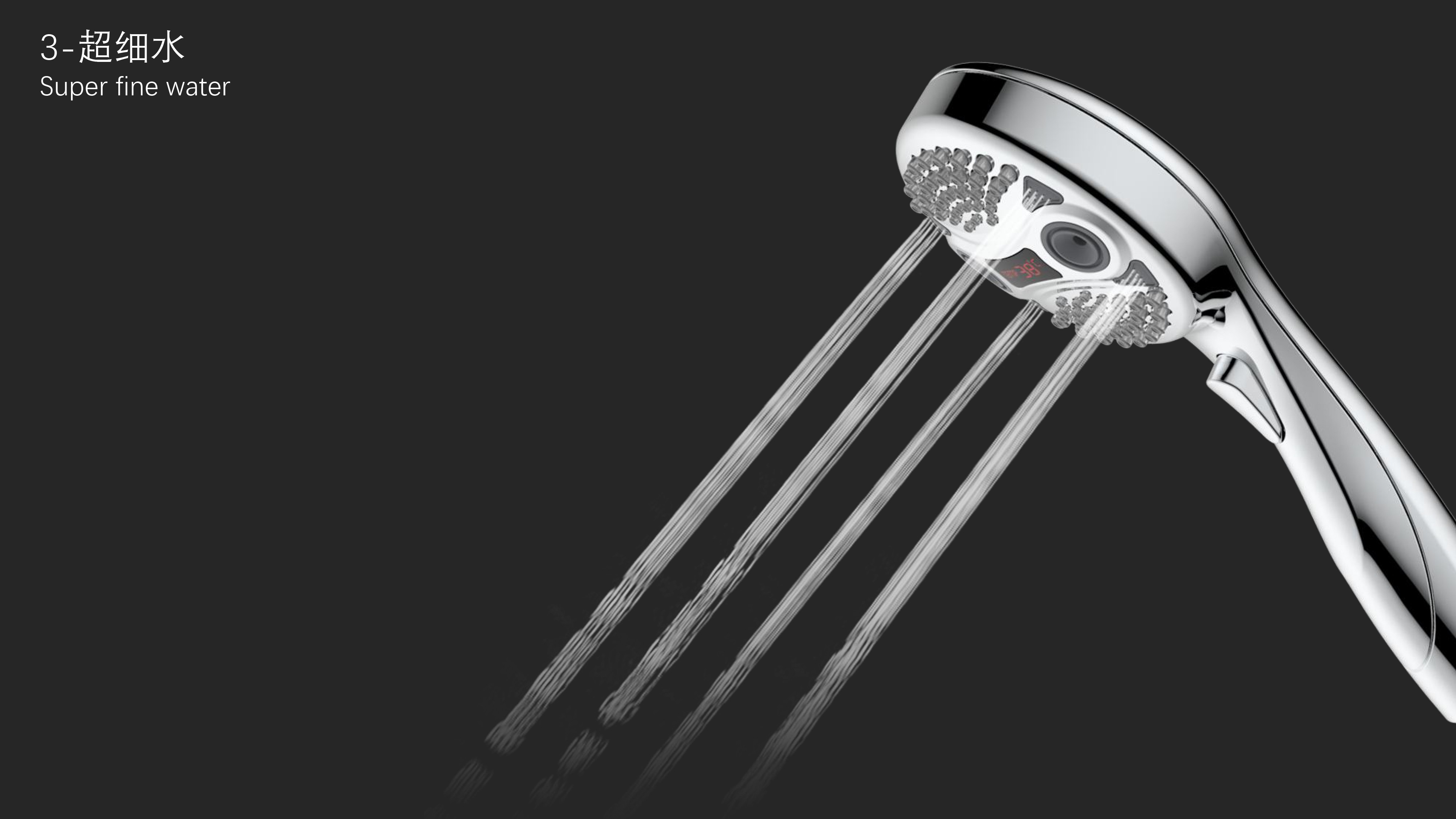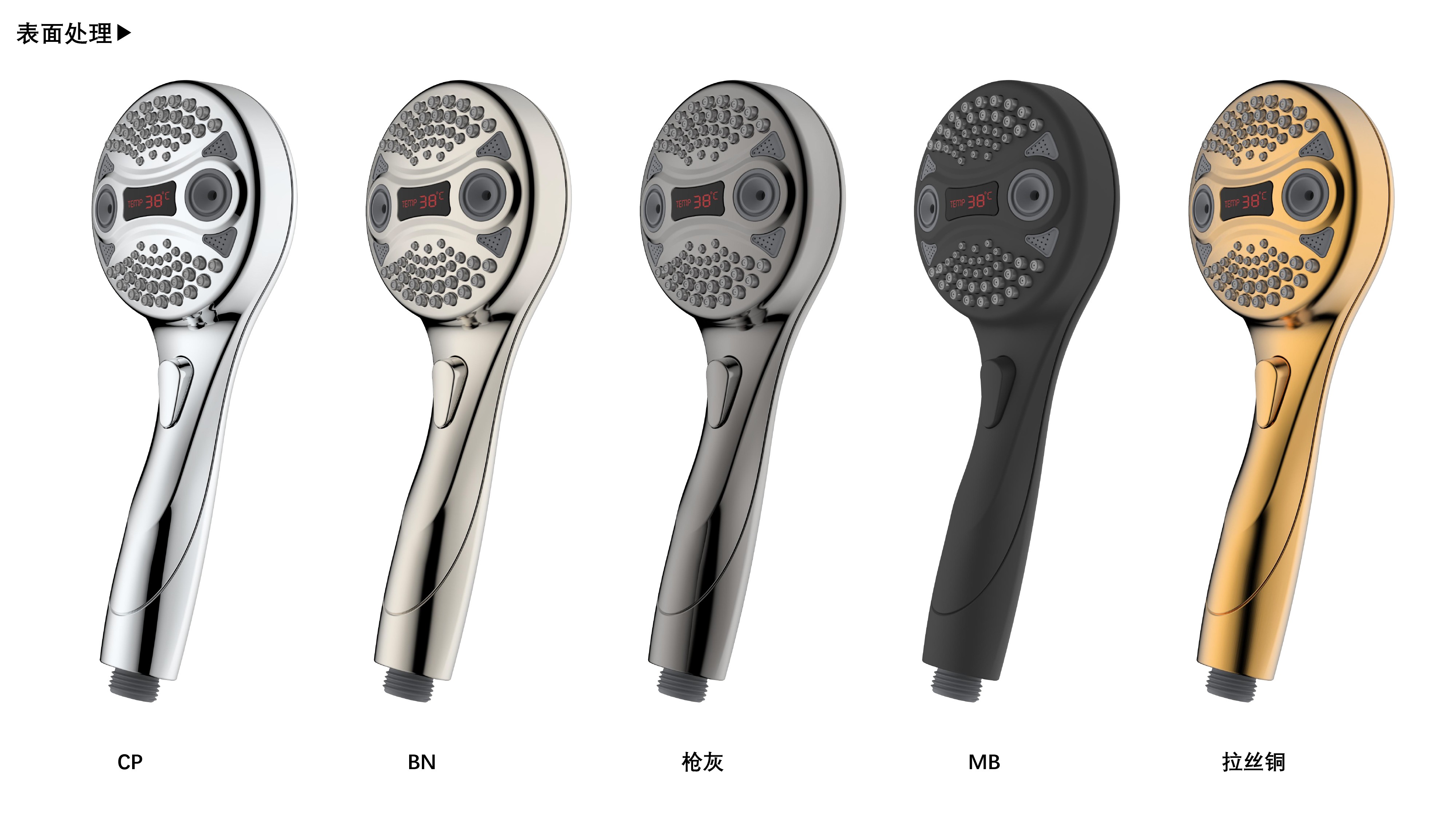 三功能溫顯花灑;獨(dú)特E.T.外觀設(shè)計(jì);TPR出水孔,輕撥除垢;LED三色出水,看得見的水溫;按鍵切換三檔模式出水;握感舒適防滑