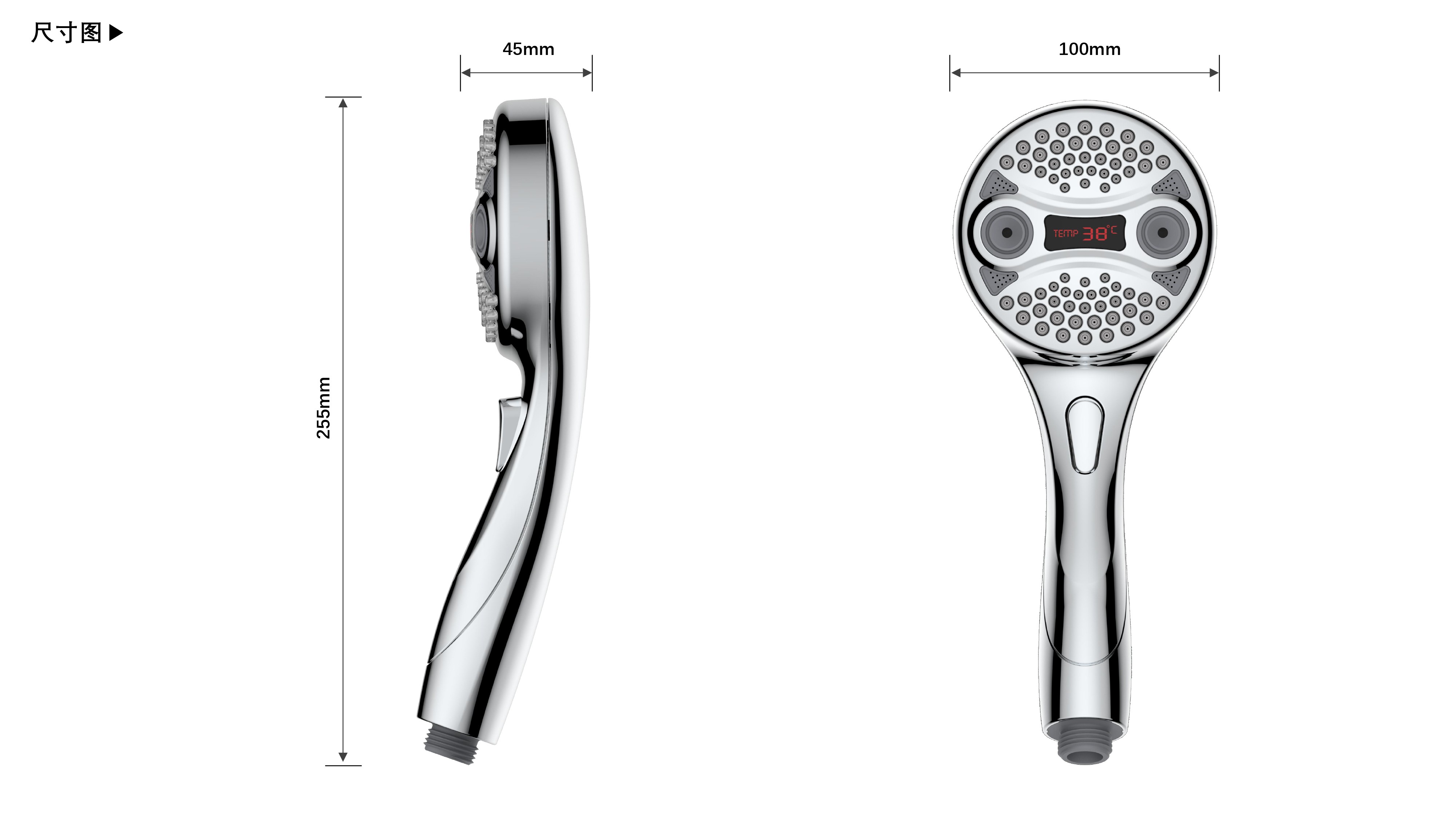 三功能溫顯花灑;獨特E.T.外觀設計;TPR出水孔,輕撥除垢;LED三色出水,看得見的水溫;按鍵切換三檔模式出水;握感舒適防滑