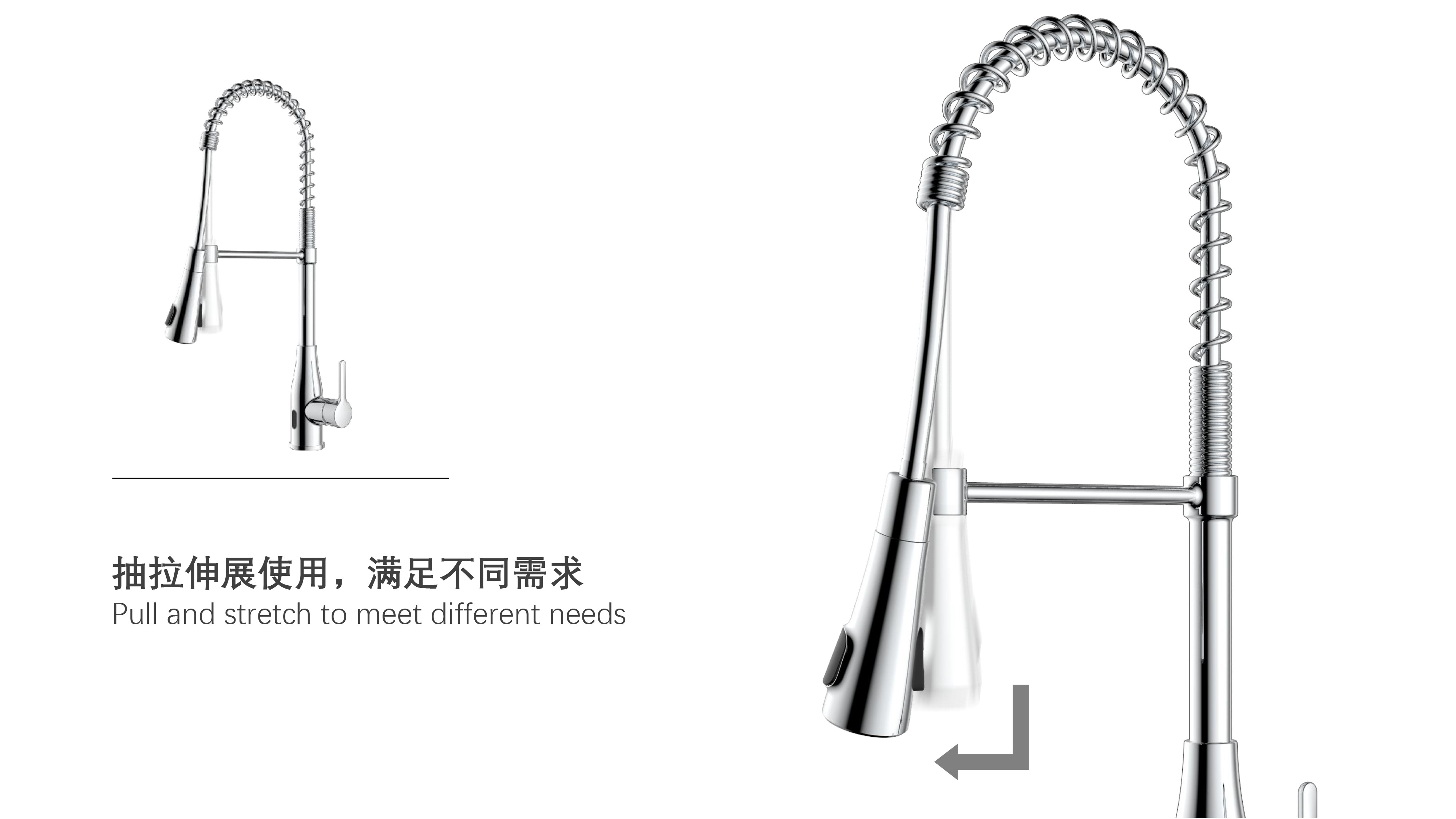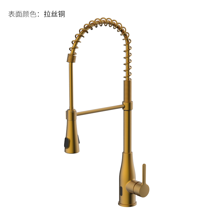 雙控廚房龍頭 ;感應(yīng)免接觸啟閉,有效感應(yīng)距離20cm;智能芯片恒溫技術(shù)雙控盒;智能芯片溫度數(shù)顯抽拉頭-冷水TEMP顯示藍(lán)色、溫水TEMP顯示綠色、熱水TEMP顯示紅色;兩種出水抽拉頭可多角度使用